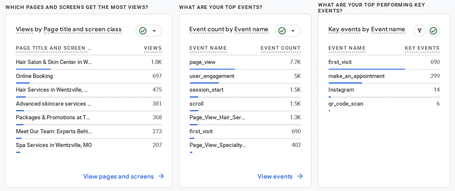 For the data-driven, the numbers tell a compelling story: organic search is driving 979 sessions (nearly triple the direct traffic), with impressive page views across all service categories - 475 for hair services, 381 for advanced skincare, and 207 for spa services. In marketing terms, this means the new structure is already delivering more balanced service visibility.